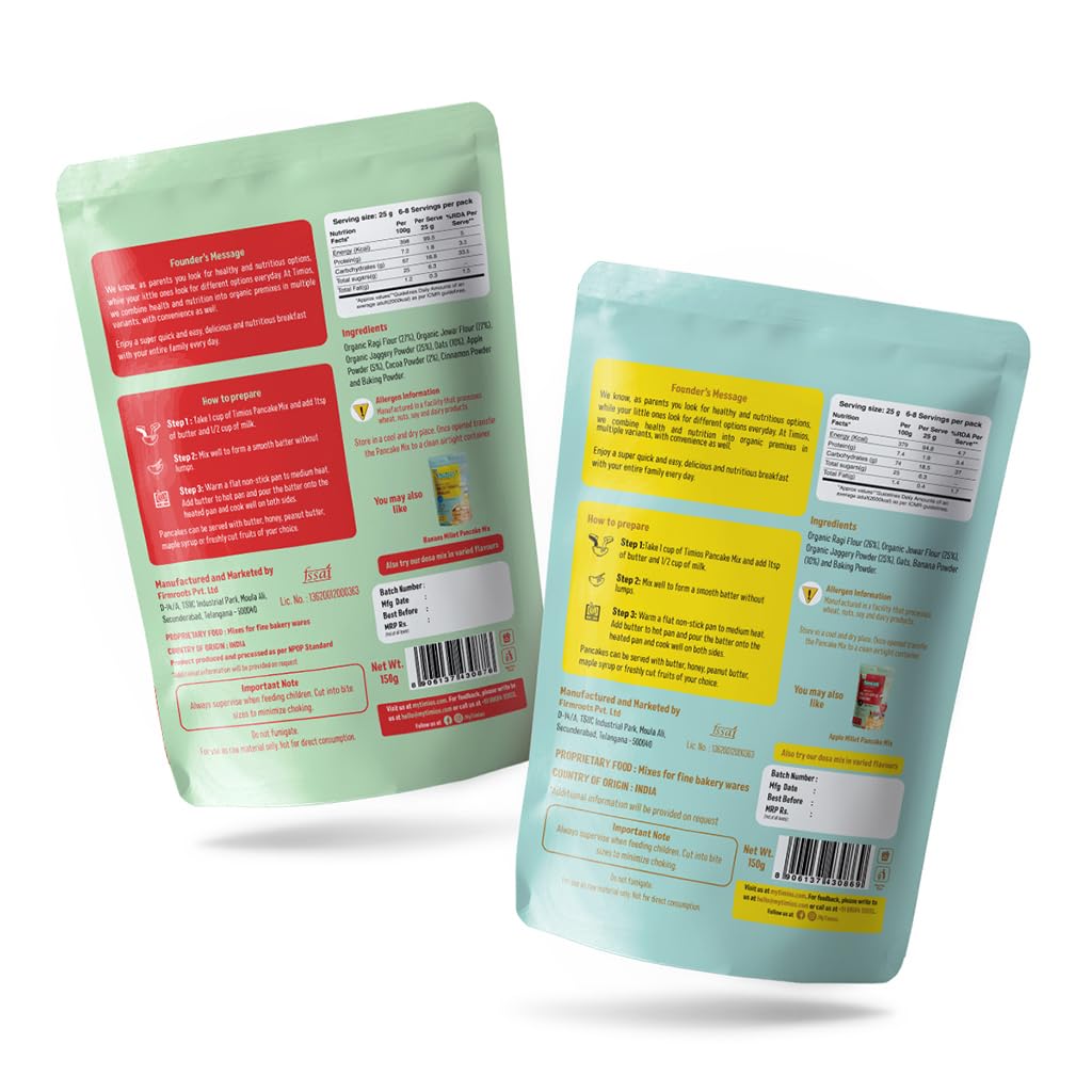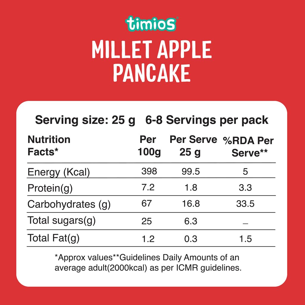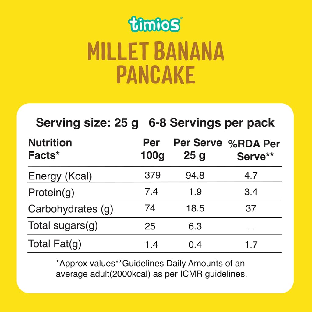 Timios Millet Pancake Mix makes flavourful fluffy and filling pancakes that satisfies the nutritional needs for every member of the family. It is packed with fiber-rich oats and millets sweetened with natural iron rich organic jaggery. In addition it has plenty of protein and other micronutrients essential for a healthy growth. Just mix it with milk and delicious pancakes are ready in a Jiffy!