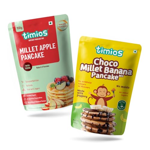 Timios Millet Pancake Mix makes flavourful fluffy and filling pancakes that satisfies the nutritional needs for every member of the family. It is packed with fiber-rich oats and millets sweetened with natural iron rich organic jaggery. In addition it has plenty of protein and other micronutrients essential for a healthy growth. Just mix it with milk and delicious pancakes are ready in a Jiffy!