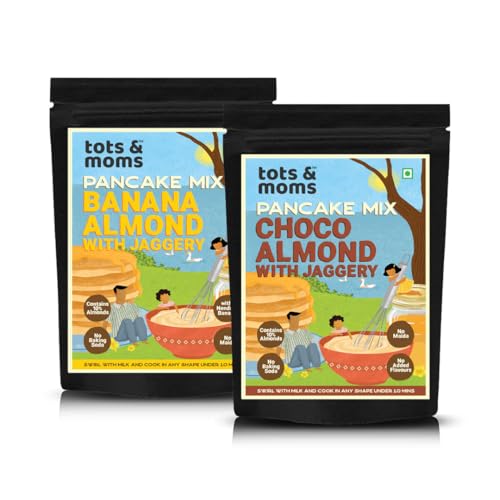 Get instant goodness with Tots and Moms Pancakes Combo - 2 Pack of 2 with Banana Almond Pancake and Choco Almond Pancake mix. Whether the tasty deliciousness of chocolate or the familiar taste of banana these wholesome mixes do not just taste good but are easy to make and can be gulped on the go. With good amounts of protein good fats fiber and nutrients of almonds these pancakes can be made quickly in a few steps enable good digestion and cane flavored with jaggery or enhanced with dry fruits. Just mix them with milk ladle over a pan cook and serve accompanied with honey or dry fruits.