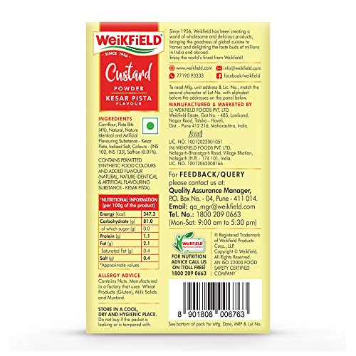 Delicious Weikfield Custard Powder Kesar Pista for children. Can be consumed as hot or cold custard and with the addition of fruit salads creamy toppings or nuts etc. Becomes a trifle pudding for a delicious ending to any meal.