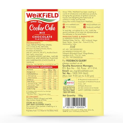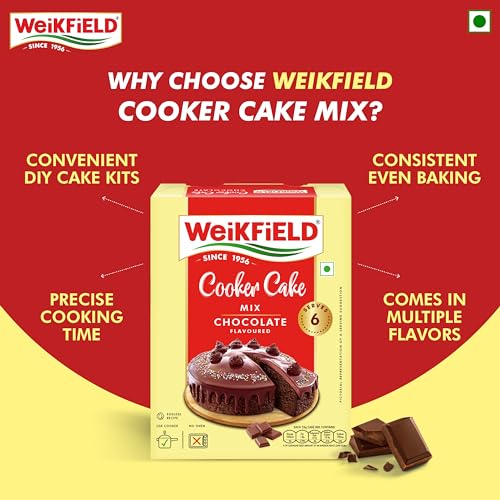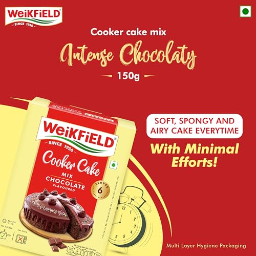 Weikfield's Chocolate flavoured Cooker Cake Mix is a tasty simple & quick solution for mothers to pamper their kids and family. A 100% Vegetarian Eggless Cake mix. Cake can be made using your normal Cooker at home. No microwave required for baking your cake. Makes delicious soft and yummy cakes at any time easily. Available in Chocolate and Vanilla flavours.