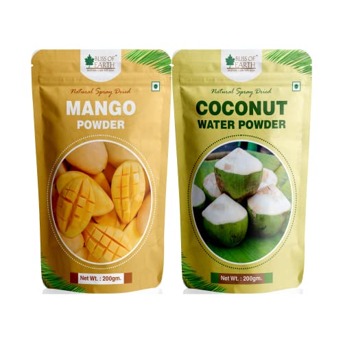 Bliss of Earth Mango Powder is derived from the juicy mangoes by spray drying method. Mango is know as the king of fruits and offers many health benefits. Mango is a good source of folate several B vitamins as well as vitamins ACK and e - all of which help boost immunity. Mango contains magnesium potassium and the antioxidant mangiferin all support healthy heart function. Mango has digestive enzymes water dietary fiber and other compounds that aid different aspects of digestive health.Bliss of Earth Coconut Water Powder is made from fresh tender coconut water by spray drying method. Coconut water powder is a rich source fo potassium magnesium phosphorus and sodium it has a light and sweet flavour and is an excellent source of nutrients and energy