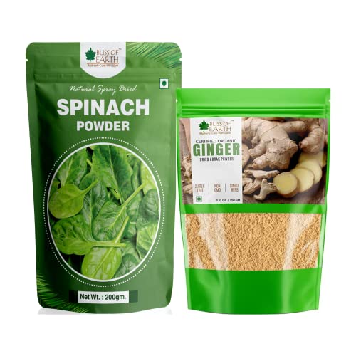Bliss of Earth spinach powder is derived from the nutrient rich leaves of spinach by spray drying method. It is known to be an excellent source of iron protein vitamin ACK calcium and other nutrients. commonly known as "PALAK" It is good for the immune system body detox skin health and heart health. Bliss of Earth Ginger Powder is a organic versatile herb known for centuries for its health benefits. The ginger used is completely dehydrated at low temperatures so that it retains all the essential nutrients and the amazing flavor it offers. 115 chemical compounds are known to be found in the ginger root making it a super antioxidant and anti-inflammatory agent. Ginger has been proven to helps in boosting immunity digestive support and cough & cold.