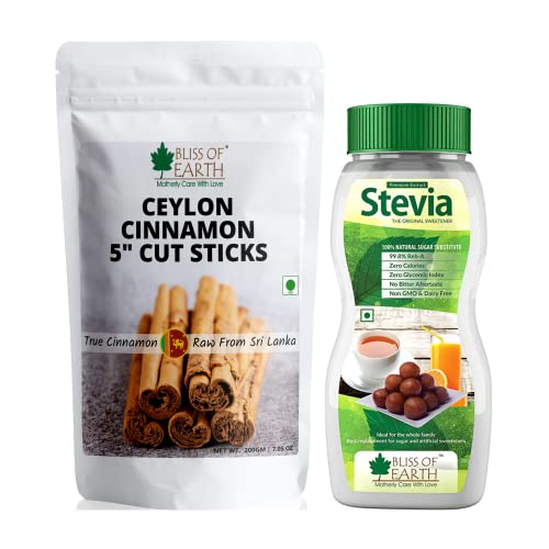 Bliss of Earth 99.8% REB-A Purity 200gm Stevia Powder, Natural & Sugarfree + 200gm Ceylon Cinnamon (Dalchini) 5" Cut Sticks True Cinnamon Raw From Sri Lanka Original
