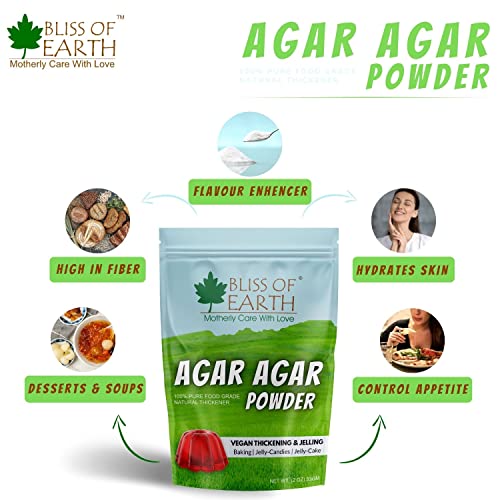 Bliss of Earth Agar Agar Powder. It is the perfect gelling agent for baking & making various desserts such as jellies custards puddings and cakes. It can also be used as a thickener gelling agent texturizer moisturizer emulsifier flavour enhancer and absorbent with excellent consistency.