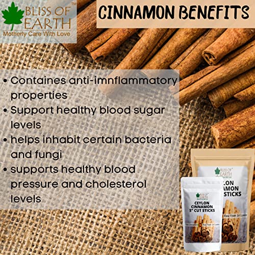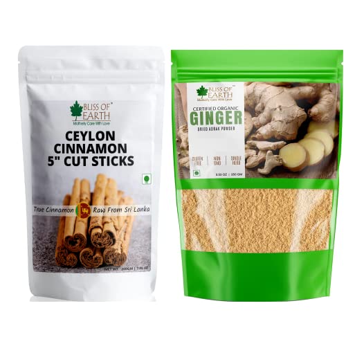 Bliss of Earth Certified Organic 250gm Ginger Powder + 200gm Ceylon Cinnamon (Dalchini) 5" Cut Sticks True Cinnamon Raw From Sri Lanka Original
