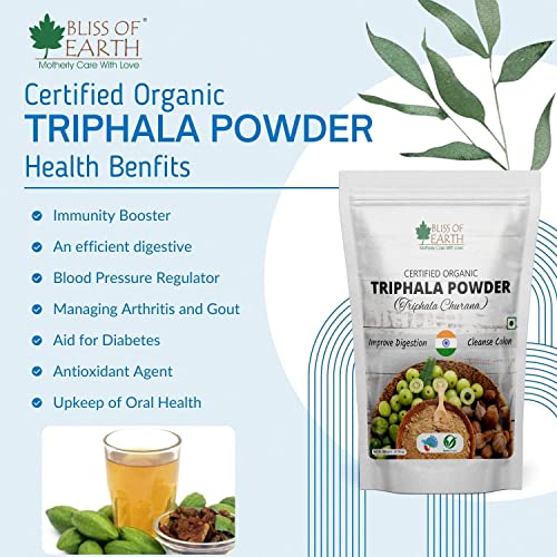 Bliss of Earth gond katira is a natural gum obtained from the dried sap of several species of Middle Eastern legumes of the genus astragalus .gond katira is a viscous odorless tasteless water soluble mixture of polysaccharides obtained from sab that is drained from the root of the plant and fried the gum seeps from the plant in twisted ribbons or flakes that can be powdered it absorbs water to become a gel which can be stirred into a paste . Bliss of Earth The Organic Triphala Powder comprises the goodness of the three fruits Amla (Emblica officinalist) Haritaki (terminalia chebula) and Bibhitaki (terminalia bellirica). It is a wonder ingredient to fight against infections and boost your immunity. It also cleanses your gut and helps relive constipations.