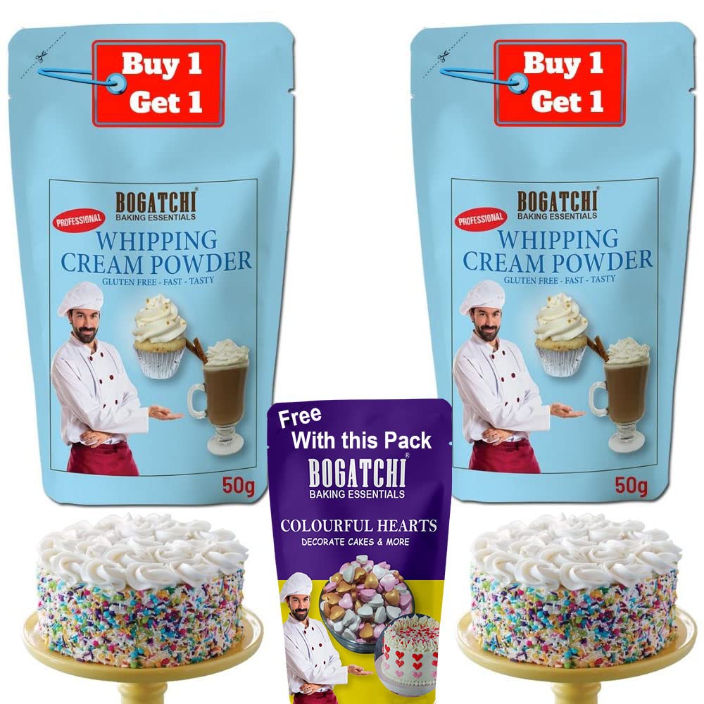 BOGATCHI Whipping Cream Powder Whipping cream for cake Premium Whipping cream Powder Whipped Cream Rich Whipping cream|FREE One Extra Whipping Cream Powder(50g)+ Colorful Hearts (20g)