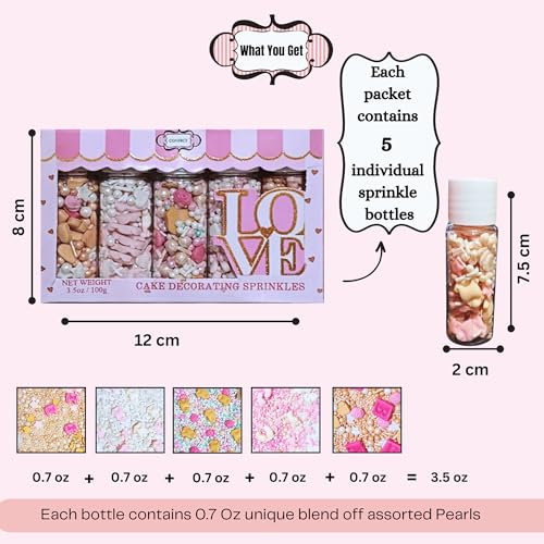 Confect Sprinkles are made with the finest quality Ingredients & are soft to chew Sprinkles come in a unique Combo pack of 5 (5 X 0.7 Oz each Bottle) assorted colors and sizes. Total weight of each pack is 3.5 Oz