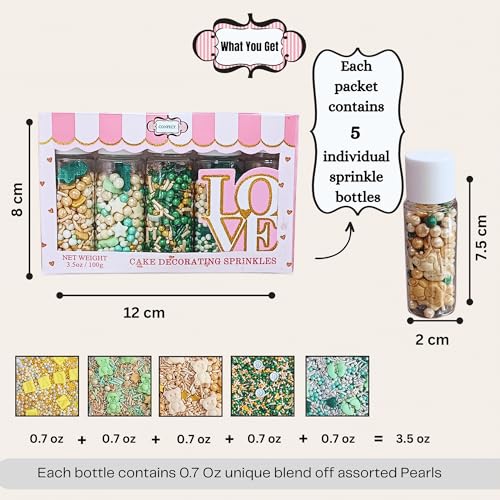 Confect Sprinkles are made with the finest quality Ingredients & are soft to chew Sprinkles come in a unique Combo pack of 5 (5 X 0.7 Oz each Bottle) assorted colors and sizes. Total weight of each pack is 3.5 Oz