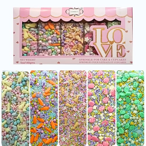 HomeGroceryCookingBaking SuppliesFrosting, Icing & DecorationsConfect Easter Sprinkles Edible | Assorted pack of 5 Green Pink and Sky Blue Pearls & Stars I Cookies Desserts & cupcake Decorating | Edible Sprinkles Mix for Baking & Cake Decorative -3.5 Oz