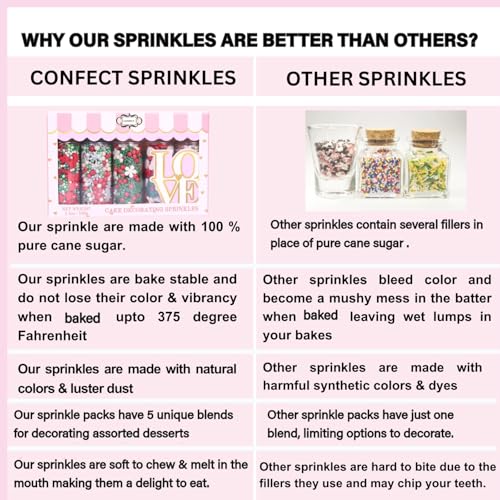 shines beautifully flawless finish CONFECT SPRINKLES ARE made with the finest quality pure cane sugar WE DO NOT USE ANY FILLERS. 100% edible 100% VEGETRAIAN CONFECT SPRINKLES works on all cakes such as whipped cream cakes fondant cake ganache cakes. Ideal for cupcakes cake pops cookies. these are heat stable SO ARE THE BEST TO BAKE WITH They do not bleed color ON cream or at the time of baking these. PACKAGING - Confect sprinkles come in reusable jars that will fit in perfectly in your pantry ready to top off your next dessert. HOLIDAYS - We have mixes & colors in all sizes ensuring we have you covered for every festival 100% BAKE STABLE - The application with Confect sprinkles are endless you cab bake with them churn them into your ice cream use them for dessert toppings.