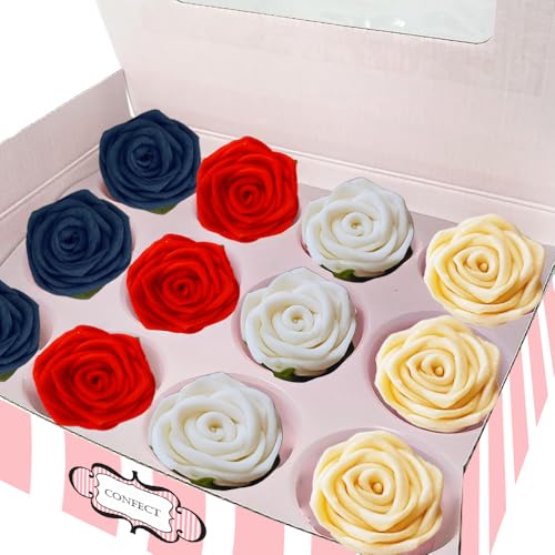 Confect Edible Patriotic Rose Cake Toppers For Cupcakes & Doughnut Edible Toppers Roses for Cake Decorations- 12 Roses (Red blue white & Pear)