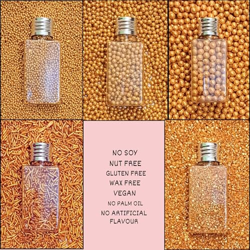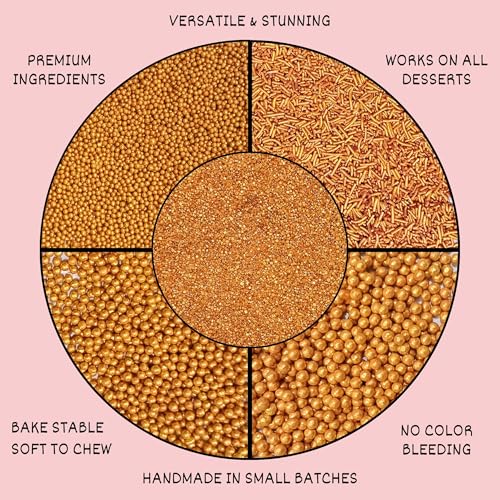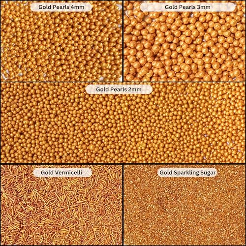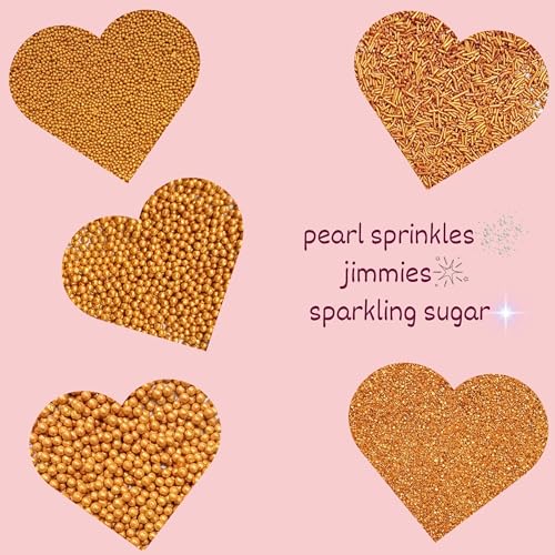 Gold Sprinkles are made up with a rich metallic gold hue these sprinkles are available in various forms including jimmies pearls & sanding sugar.