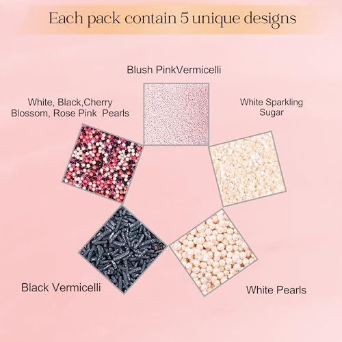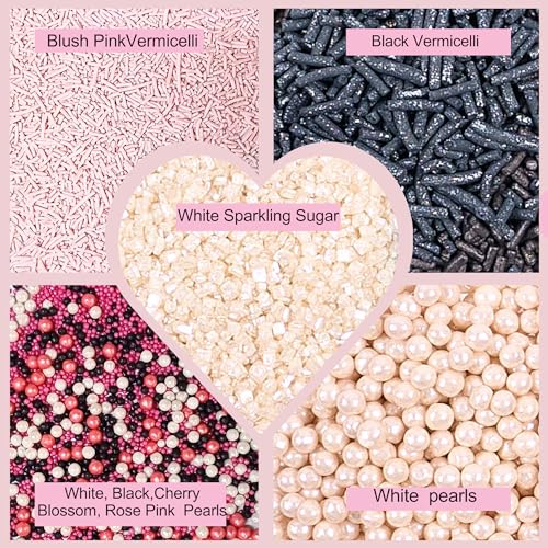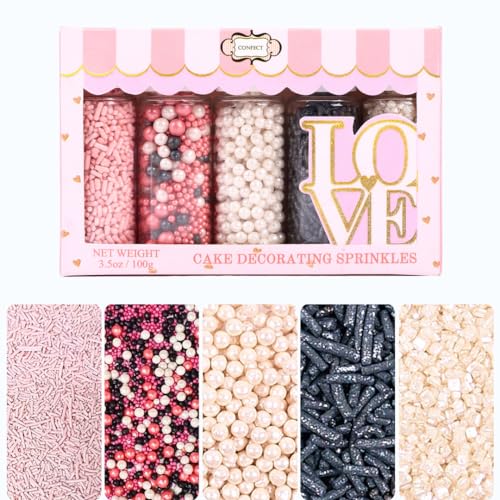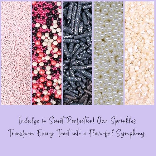 Confect Sprinkles for Cakes & Cupcakes Decoration Assorted pack of 5 Backyard Bake off Sprinkles Mix Black Pink & Pearl Dragees Baby Pink & Black Jimmies Sparkling Pearl Sugar - 3.5 Oz
