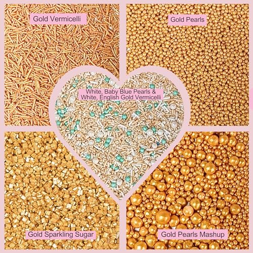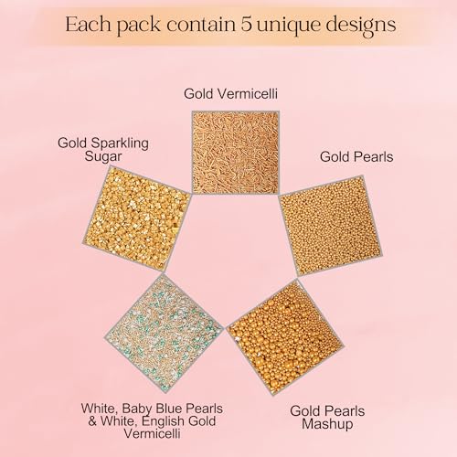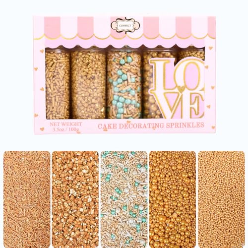 Confect Sprinkles for Cakes & Cupcakes Decoration | Assorted pack of 5 | Celebration & Spring Sprinkles | Mix Yellow Teal & Pearl Dragees Champagne Gold Jimmies Sparkling Gold Sugar - 3.5 Oz