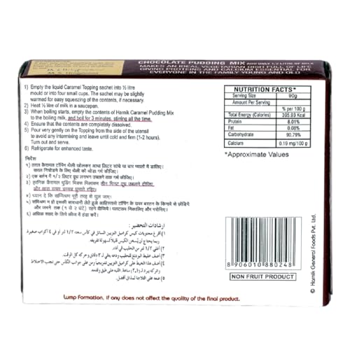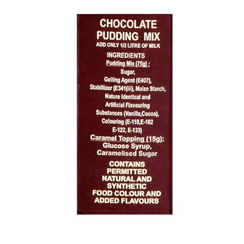 The product in displays is a pack of chocolate caramel pudding (pack of 5) which consists of pudding mix (75g)sugar gelling agent (e407)stabilizer (e341 (iii))nature identical and artificial flavouring substances(vanillacocoa)colouring (e-102e110e122e133).Caramel topping (15g): glucose syrup caramelised sugar.Contains permitted natural and synthetic food colours and added flavours.The package contains 450 gm and has shelf life of 24 months.It is recommended to store in a cool & dry place away from direct sunlight and away from odourful products such as soaps etc.