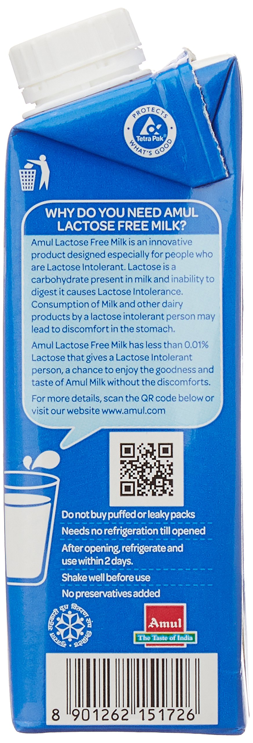 Amul Lactose Free milk with less than 0.01 percent lactose content this milk has all the goodness of protein calcium vitamins and pre-digested Lactose that helps in easy digestion of milk for lactose intolerant people