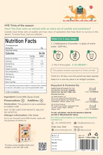 • PURE AND NATURAL HYE - Foods Camel Milk Powder is freshly and ethically sourced and is 100% pure and natural.