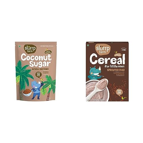 Slurrp Farm Coconut Sugar – Natural Sweetener 300g• Made from high grade sap of flower buds of coconut palm trees. Unrefined Unprocessed and No Additives • An excellent natural replacement to processed refined white sugar and brown sugar. Use as a substitute to processed sugars in 1:1 ratio • Low GI - In the Glycemic Index chart Coconut sugar ranks just 35 while regular table sugar ranks between 60 and 75. Choose the healthier sugar • Best used in Porridge Cereals Milk Shakes Halwa Kheer Pancakes Cakes Homemade sweets or with just anything you would like to sweeten • No Preservatives artificial colours or enhancersSlurrp Farm Sprouted Ragi Powder |100% Natural Ragi Flour/Nachni Flour/Ragi Satva/Kodra/Taidalu/Kezhvaragu/Finger Millet Flour| No Milk No Sugar No Salt | 250gSlurrp Farm is founded by two mothers for their children and yours. Our mission is to provide tasty and all natural alternatives to the junk food that surrounds us today. This means no preservatives no artificial flavours and no artificial colours. We are passionate about raising awareness of healthy eating for children by giving parents convenient food options which are as good as what we would make at home.