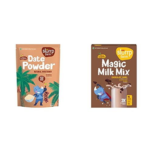 Slurrp Farm Seedless Arabian Date Powder | Kharik/Khajur Powder | 100% Natural Sweetener | No Preservatives No Chemicals | Healthy Substitute for Refined Sugar | Dates Powder for Babies 300g• 100% natural dates powder made from high quality premium Arabian dates. With NO additives and fillers enjoy the complete nutrition benefits of Dates. • Dates are rich in Dietary fibre Anti-oxidants Iron Calcium Vitamins and Potassium - great for immunity boosting gut health heart and brain health. • Dates powder is a natural sweetener thus you can simply replace the refined white sugar or brown sugar with Dates Powder – the healthy sweetener. Simply replace the sugar at 1:1 ratio. Dates powder not only sweetens but also adds to nutritious value to food or drink it is added to. • From the house of Slurrp Farm - A brand made by 2 mothers.Slurrp Farm High Protein Chocolate Swirl Milk Mix | No Maida No Sugar | Contains Goodness of Millets- Made with Ragi and Jowar | 250gIntroducing Slurrp Farm No Sugar Chocolate Swirl Milk Mix high in protein and made with all natural ingredients. This perfect companion to milk has no added sugar no wheat no preservatives and no chemicals. It is mildly sweetened with jaggery and made with supergrain millets like ragi oats and jowar. The healthy milk mix is rich in protein calcium iron and other essential nutrients necessary for the growth of your child without any added artificial flavors or colors.