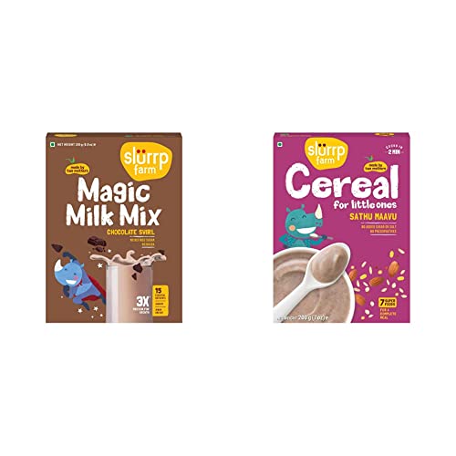 Slurrp Farm High Protein Chocolate Swirl Milk Mix | No Maida No Sugar | Contains Goodness of Millets- Made with Ragi and Jowar | 250gIntroducing Slurrp Farm No Sugar Chocolate Swirl Milk Mix high in protein and made with all natural ingredients. This perfect companion to milk has no added sugar no wheat no preservatives and no chemicals. It is mildly sweetened with jaggery and made with supergrain millets like ragi oats and jowar. The healthy milk mix is rich in protein calcium iron and other essential nutrients necessary for the growth of your child without any added artificial flavors or colors.Slurrp Farm Sathu Maavu | 100% Natural Multigrain Health Mix with The Goodness of 7 Superfoods | No Salt No Sugar No Milk | 200gIngredients: Ragi Jowar(Sorghum) Foxtail Millet Moong Dal Bengal Gram Brown Rice Almond Flour Cardamom powder Vitamins and Minerals How to Use: 1. Add 1/2 cup of water or milk into a pan 2. Add 3 level table spoons (30 gms) of Sathu Maavu mix 3. Mix well to remove the lumps 4. Cook on a medium flame for 3-5 mins and stir continuously to avoid lumps 5. Cool to room temperature and feed immediately | Once the pack is opened transfer the contents to an airtight container store in cool dry place or in a refrigerator | At Slurrp Farm brand made by 2 Mothers we are passionate about raising awareness of healthy eating for children and giving busy parents like us the convenience needed in terms of being able to find food options which are as good as what we would make at home.