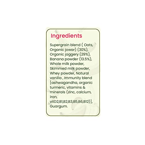 No Added Sugar mildly sweetened with jaggery powder. Contains No wheat. Made with millets that are organic grains by nature and oats that are rich in fibre and iron. Ashwagandha Turmeric Vitamins and minerals in the milk mix help boost immunity. No preservatives artificial colours or flavours. Just no Junk.
