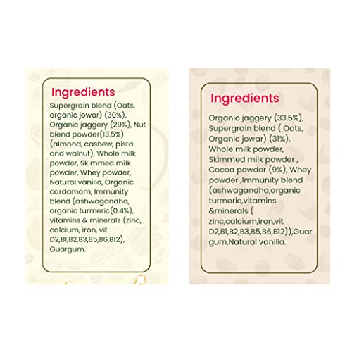 No Added Sugar mildly sweetened with jaggery powder. Contains No wheat. Made with millets that are organic grains by nature and oats that are rich in fibre and iron. Ashwagandha Turmeric Vitamins and minerals in the milk mix help boost immunity. No preservatives artificial colours or flavours. Just no Junk.