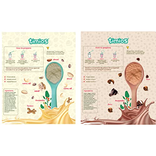 Timios High Protein Nuts & Turmeric & Chocolate Swirl Milk Mix | No Sugar | Supergrain Blend of Oats | Organic Jowar | 250g Each | Pack of 2