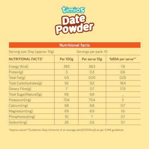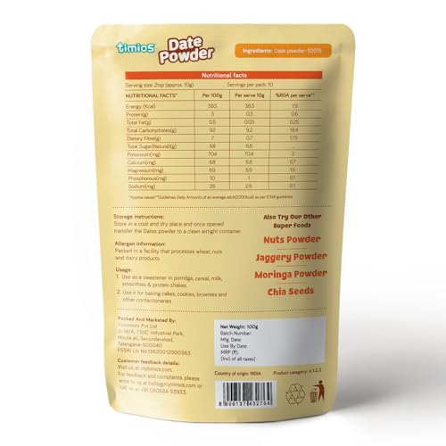 Timios Date Powder, Used as Natural Sweetener, Filled with Essential Vitamins and Minerals, Rich in Fiber, for Kids, Expecting Mothers and Adults, Pack of 1, 100g