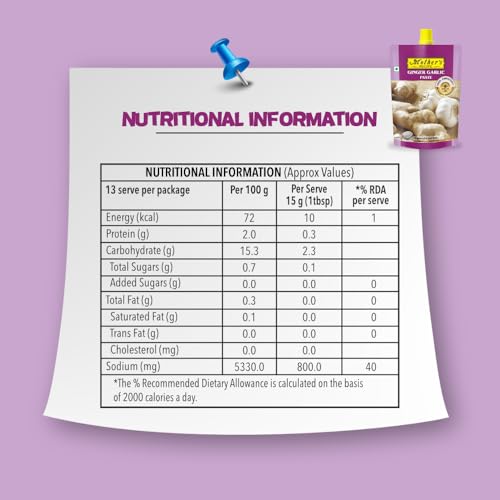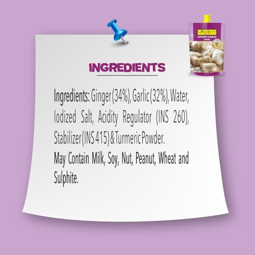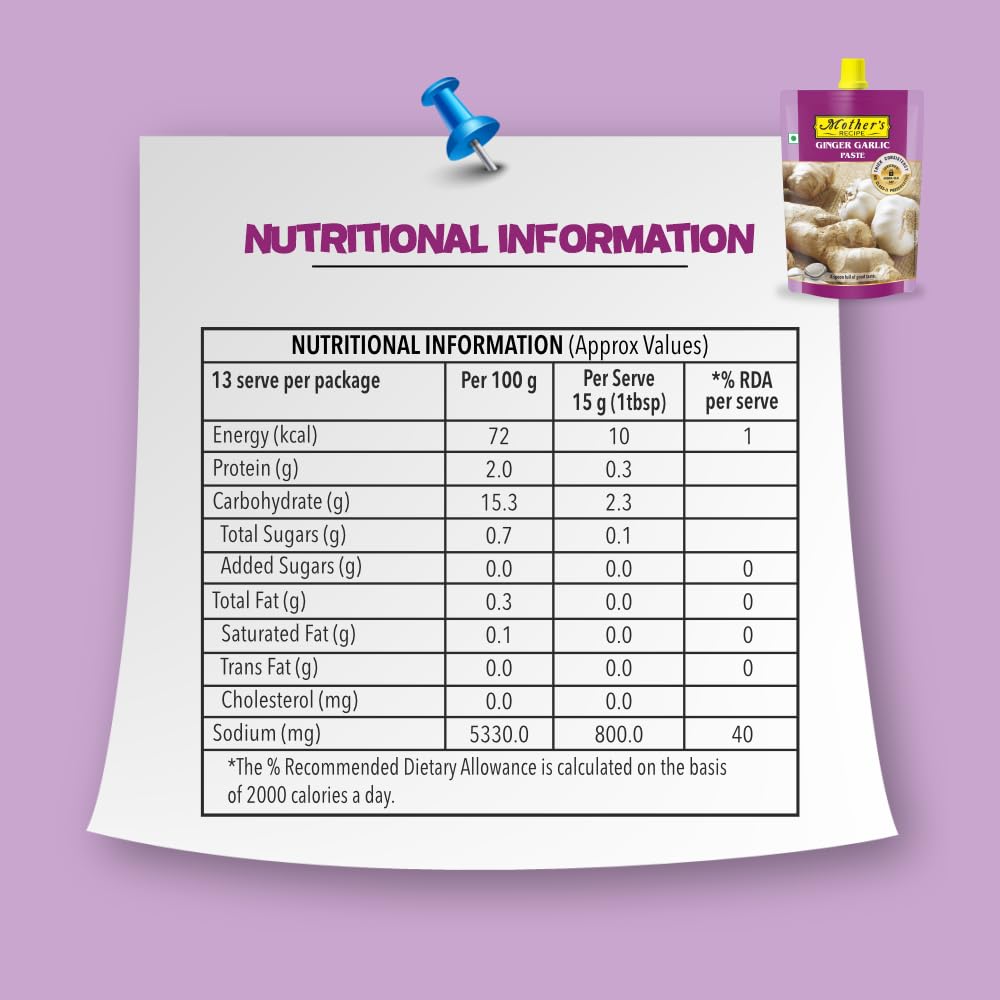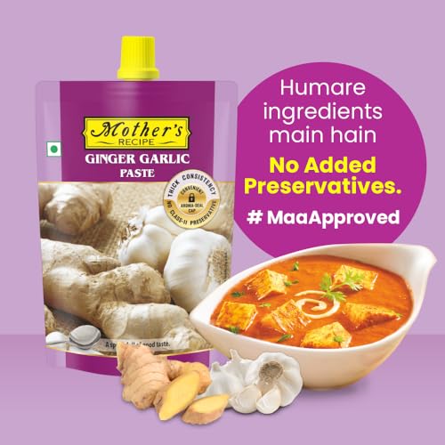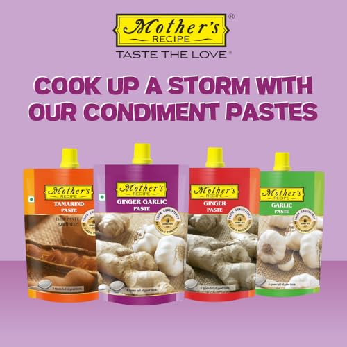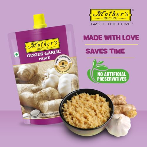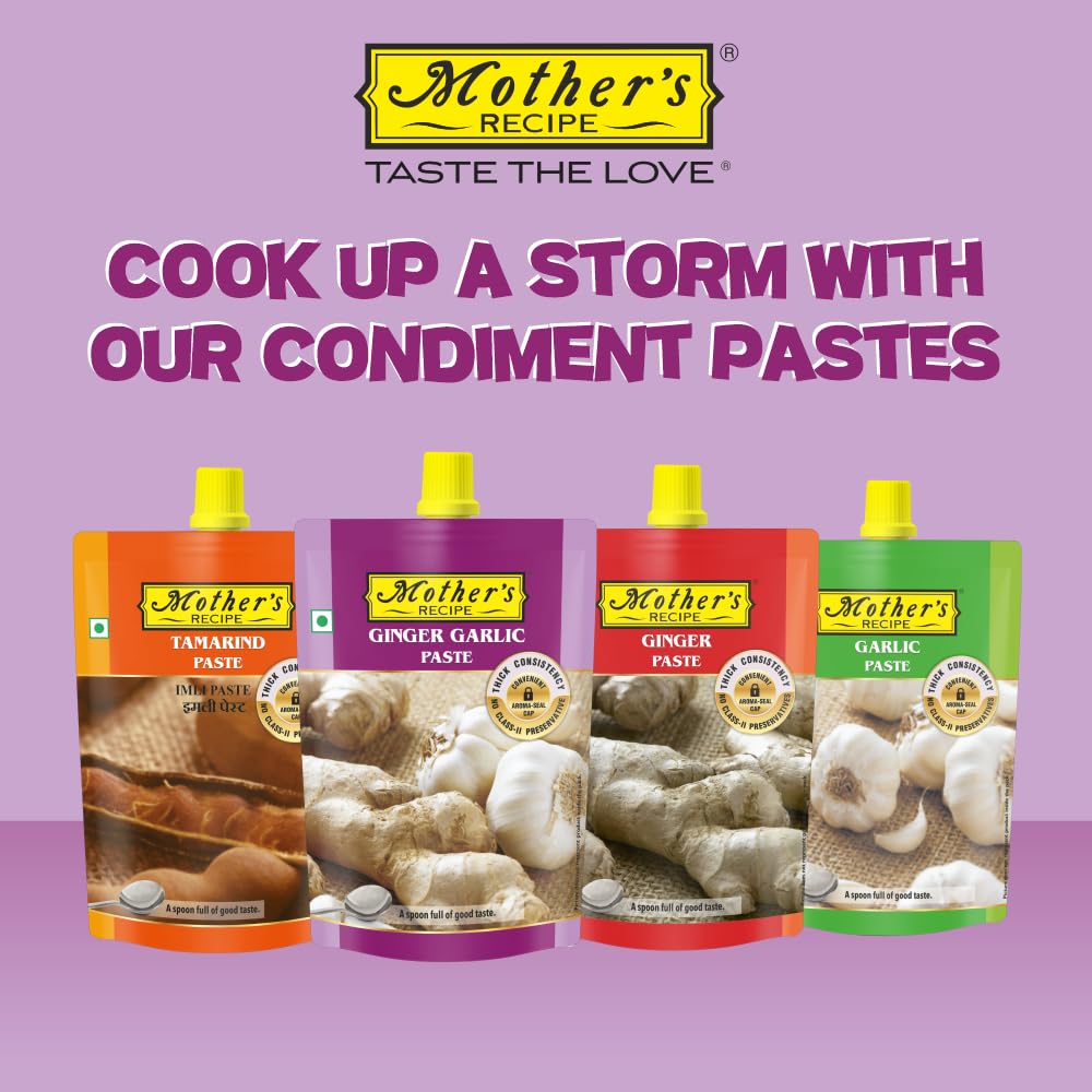 Remember grand mother's stone ground ginger & garlic paste. And its aroma made you hungrier. Mothers Recipe ginger & garlic paste creates same magic. It's made in the traditional way with fresh ginger & garlic and is free from any chemical preservatives which ensures paste come to you in its tastiest form.Every time you use it in your cooking the dish gets the delicious taste.