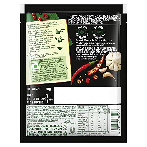 Just like you we love everything about food because no delicious meal is cooked without love. Love for carefully selected ingredients flavours the aroma of dinner wafting through your home love of serving people who matter the most to you. With Knorr as your cooking partner you can serve your loved ones nutritious and flavourful meals at home. Made with top quality ingredients such as soya green chillies and garlic Knorr Chinese Chilli Gravy Mix packs a real spicy punch. Knorr has four interesting Chinese Ready To Cook variants âChinese Chilli Manchurian Schezuan gravy mixes and Fried Rice/Noodles instant mix. Great taste is in our nature! Now make Restaurant-like Chinese at home with Knorr Chinese Easy to Cook in just 3 steps. Make in 3 Easy Steps: Stir fry 2 cups chopped vegetables and 1 to 2 green chillies till they are cooked In a separate bowl mix the contents of this pack with 450 ml water. Add vegetables & cook till sauce becomes thick. Add 125 g fried paneer to the sauce & cook for 1 min. Garnish & Serve hot!
