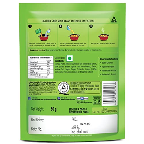 We bring to you recipes inspired from the master chefs of ITC hotels. Our range of cooking pastes ensure that you can enjoy a fragrant biryani to a flavour-packed butter masala gravy all at the comfort of your home. Only three easy steps to cook authentic Indian dishes like paneer makhani to mutton kolhapuri our range ensure that every day is a feast under 30 minutes. - No added preservatives - authentic recipes- vegetarian product- natural ingredients no artificial flavours- cook complete dish in 3 easy steps- range of 5 dishes - hyderabadi biryani mutton kolhapuri butter chicken paneer makhani vegetable biryani