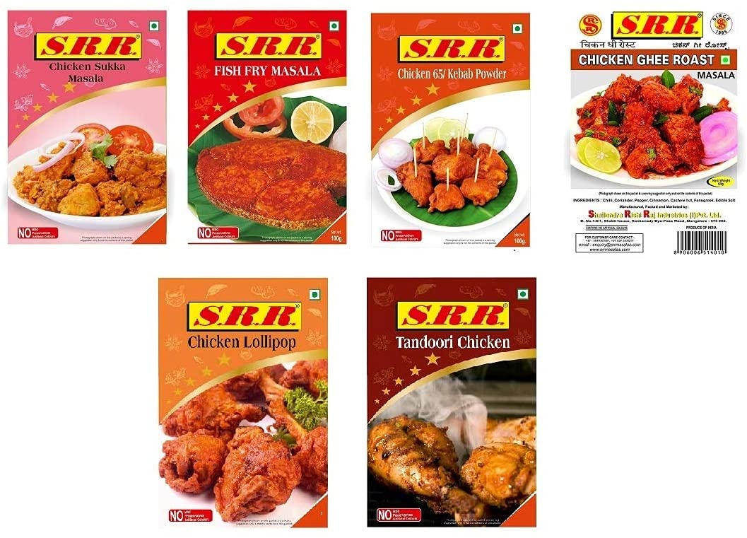 SRR Chicken SukkaFish Fry Chicken Kebab 65 Chicken Ghee Roast Lollypop MasalaTandoori Masala 500 Grams Each Pack No Artificial Colors or Flavors
