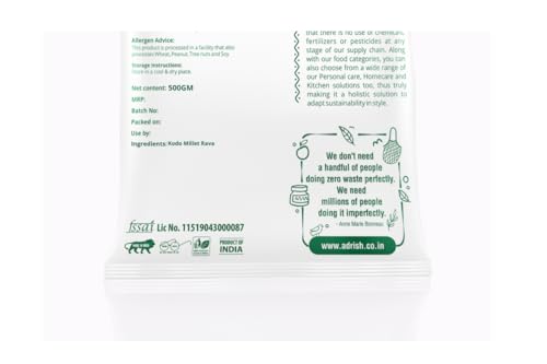 Adrish Zerowaste Organic Kodo Millet Rava (500gm) - Unpolished Millet Suji | Stoneground Millet Rava Upma | Kodo Millet Upma Rava | High Plant Protein & Fiber