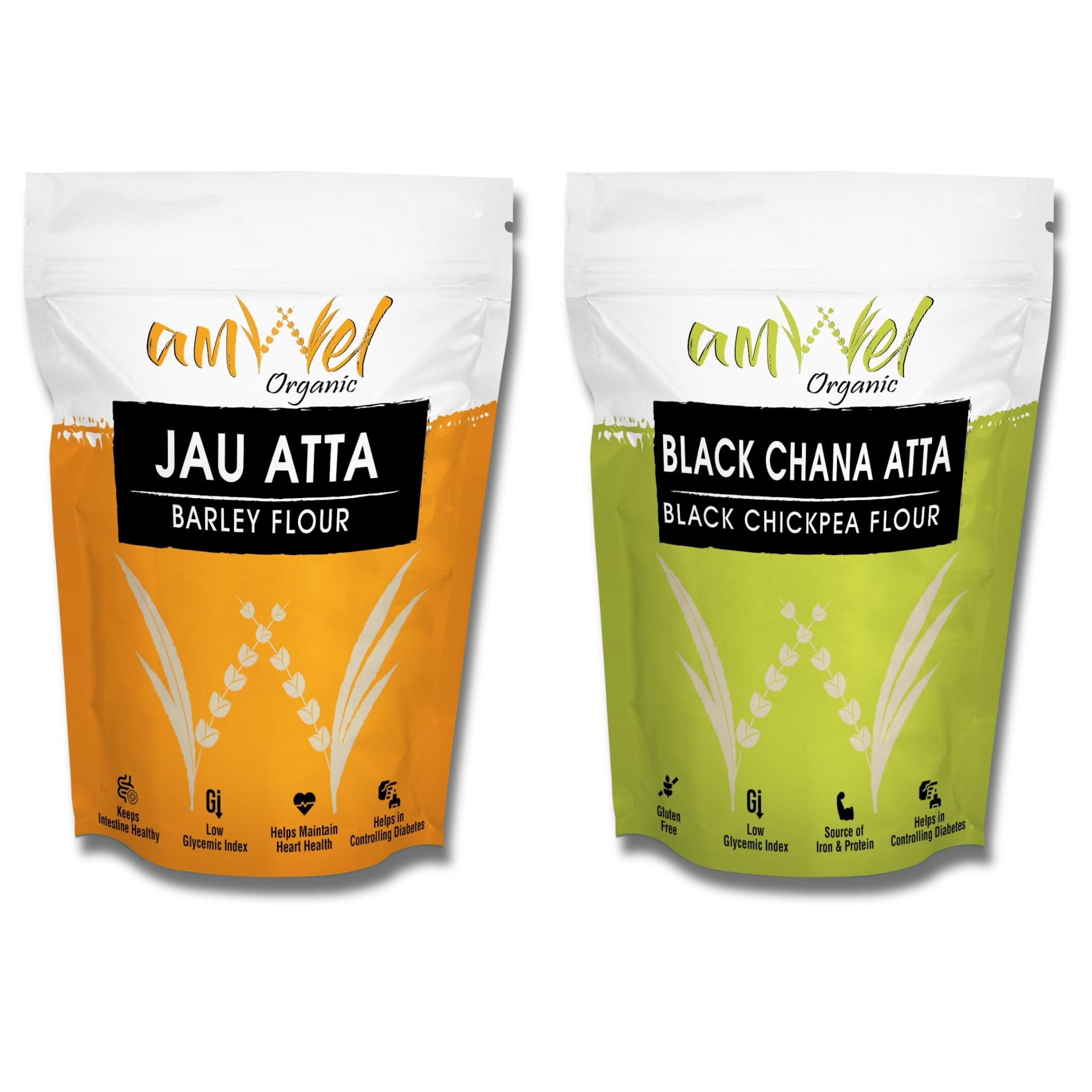 Amwel Combo of Jau Atta 450g + Black Chana Atta 450g | Barley Flour + Chickpea Flour | Diabetic Friendly Low GI Atta for Chapati | Weight Management | For Good Health | 900g | Vacuum Packed