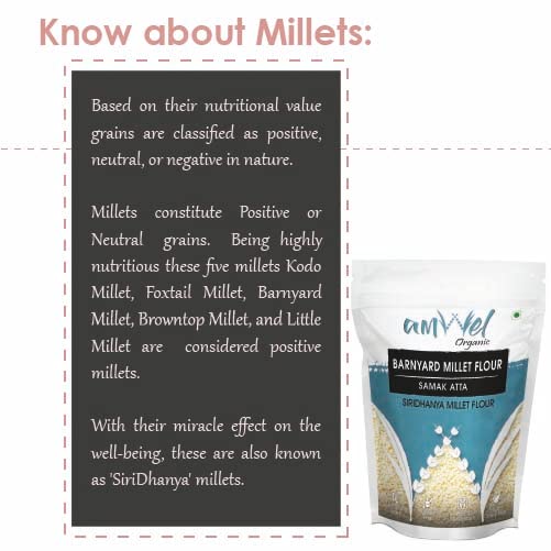Know You Millets : Based on their nutritional value grains are classified as positive neutral or negative in nature. Millets constitute Positive or Neutral grains. Being highly nutritious these five millets Kodo Millet Foxtail Millet Barnyard Millet Browntop Millet and Little Millet are considered positive millets. Benefits of Kodo Millet Flour: BARNYARD MILLET PURIFIES BLOOD: Barnyard Millet helps in purifying the blood and efficient functioning of bone marrow and helps to get rid of kidney problems. BARNYARD MILLET HELP DIABETIC MANAGEMENT: Barnyard millet intake is found to reduce fasting blood glucose level & promotes significant increase in serum insulin benefiting diabetic patients. GOOD FOR LIVER: Barnyard Millets helps in cleaning up liver and gallbladder. It also helps in reducing jaundice and strengthening liver function. Some Health Aspects of Small Millets: Small millets also known as Siridhanya Millets are a boon given to us by nature. These are the food grains having medicinal properties. They are in fact health capsules. By eating them regularly for 6 months to 2 years everybody can get rid of their diseases. The specific diseases prevented by each small Millet: 1. Foxtail millet: It is good for the strengthening of nerves and mental health. It provides relief from arthritis Parkinson's disease and epilepsy. 2. Kodo millet: It helps in purifying blood improving resistance power and overcoming anemia and diabetes constipation and is good for sound sleep. 3. Barnyard millet: It is good for the liver kidney and endocrinal glands. It helps in reducing cholesterol and jaundice. 4. Little millet: It helps in overcoming the problems of ovaries sperm PCOD and infertility. 5. Browntop millet: It helps overcome the problems of ovaries arthritis B.P. Thyroid eyes and obesity.
