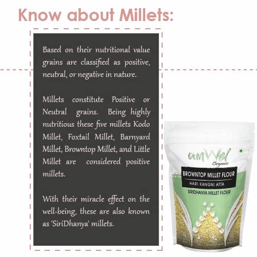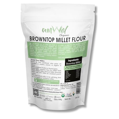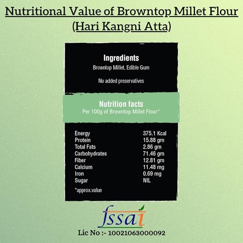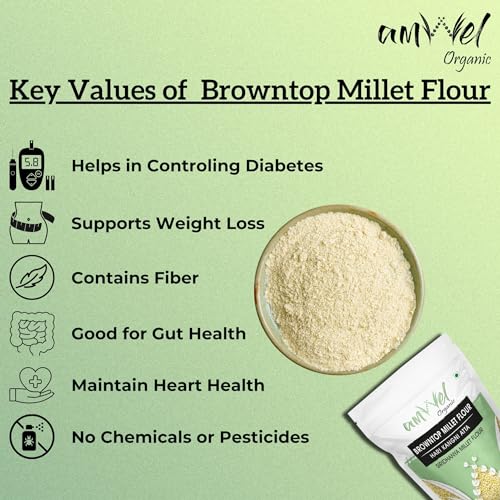 Know You Millets : Based on their nutritional value grains are classified as positive neutral or negative in nature. Millets constitute Positive or Neutral grains. Being highly nutritious these five millets Kodo Millet Foxtail Millet Barnyard Millet Browntop Millet and Little Millet are considered positive millets. Benefits of Kodo Millet Flour: BROWNTOP MILLET PURIFIES BLOOD: Browntop Millet helps in purifying the blood and efficient functioning of bone marrow and helps to get rid of kidney problems. BROWNTOP MILLET HELP DIABETIC MANAGEMENT: Barnyard millet intake is found to reduce fasting blood glucose level & promotes significant increase in serum insulin benefiting diabetic patients. BROWNTOP MILLET HELPS SOLVE BODY PROBLEMS : It helps in solving problems of stomach arthritis BP thyroid eye problems and obesity. Some Health Aspects of Small Millets: Small millets also known as Siridhanya Millets are a boon given to us by nature. These are the food grains having medicinal properties. They are in fact health capsules. By eating them regularly for 6 months to 2 years everybody can get rid of their diseases. The specific diseases prevented by each small Millet: 1. Foxtail millet: It is good for the strengthening of nerves and mental health. It provides relief from arthritis Parkinson's disease and epilepsy. 2. Kodo millet: It helps in purifying blood improving resistance power and overcoming anemia and diabetes constipation and is good for sound sleep. 3. Barnyard millet: It is good for the liver kidney and endocrinal glands. It helps in reducing cholesterol and jaundice. 4. Little millet: It helps in overcoming the problems of ovaries sperm PCOD and infertility. 5. Browntop millet: It helps overcome the problems of ovaries arthritis B.P. Thyroid eyes and obesity. In stock FREE delivery Thursday 22 May to Yamunanagar 135001. Details https://www.amazon.in/Amwel-Organic-Browntop-Diabetic-Friendly/dp/B0BYVKZGYY Specialty=âGluten Free|||Weight=â2250 Grams|||Ingredient Type=âFlour (Powder)|||Brand=âAmwel|||Region Produced In=âIndia|||Item package quantity=â1|||Form=âGrain|||Package Information=âBag|||Manufacturer=Amwel Nutrients Pvt Ltd|||Net Quantity=â2250.0 gram|||Product Dimensions=â8 x 6 x 12 cm; 2.25 kg|||Ingredients=âBrowntop Millet|||Country of Origin=âIndia|||ASIN=B0BYVKZGYY|||Customer Reviews=5.0 5.0 out of 5 stars 1 rating var dpAcrHasRegisteredArcLinkClickAction; P.when('A' 'ready').execute(function(A) { if (dpAcrHasRegisteredArcLinkClickAction !== true) { dpAcrHasRegisteredArcLinkClickAction = true; A.declarative( 'acrLink-click-metrics' 'click' { allowLinkDefault": true } function (event) { if (window.ue) { ue.count("acrLinkClickCount" (ue.count("acrLinkClickCount") || 0) + 1); } } ); } }); P.when('A' 'cf').execute(function(A) { A.declarative('acrStarsLink-click-metrics' 'click' { "allowLinkDefault" : true } function(event){ if(window.ue) { ue.count("acrStarsLinkWithPopoverClickCount" (ue.count("acrStarsLinkWithPopoverClickCount") || 0) + 1); } }); }); 5.0 out of 5 stars|||Best Sellers Rank=#128472 in Grocery & Gourmet Foods (See Top 100 in Grocery & Gourmet Foods) #549 in Multigrain Flour|||Date First Available=9 July 2021|||Item Weight=2 kg 250 g|||Item Dimensions LxWxH=8 x 6 x 12 Centimeters|||Generic Name=Browntop Millet Flour