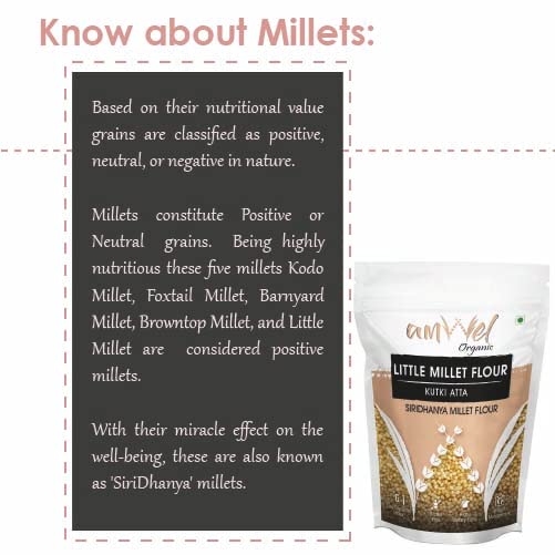 Know You Millets : Based on their nutritional value grains are classified as positive neutral or negative in nature. Millets constitute Positive or Neutral grains. Being highly nutritious these five millets Kodo Millet Foxtail Millet Barnyard Millet Browntop Millet and Little Millet are considered positive millets. Benefits of Kodo Millet Flour: LITTLE MILLET PURIFIES BLOOD : Littlel Millet helps in purifying the blood and efficient functioning of bone marrow and helps to get rid of kidney problems. LITTLE MILLET HELP DIABETIC MANAGEMENT: Little millet intake is found to reduce fasting blood glucose level & promotes significant increase in serum insulin level benefiting diabetic patients. GOOD FOR REPRODUCTIVE SYSTEM: Little Millet help in curing the diseases of the reproductive systems in both males and females. It also reduces PCOD in females. Some Health Aspects of Small Millets: Small millets also known as Siridhanya Millets are a boon given to us by nature. These are the food grains having medicinal properties. They are in fact health capsules. By eating them regularly for 6 months to 2 years everybody can get rid of their diseases. The specific diseases prevented by each small Millet: 1. Foxtail millet: It is good for the strengthening of nerves and mental health. It provides relief from arthritis Parkinson's disease and epilepsy. 2. Kodo millet: It helps in purifying blood improving resistance power and overcoming anemia and diabetes constipation and is good for sound sleep. 3. Barnyard millet: It is good for the liver kidney and endocrinal glands. It helps in reducing cholesterol and jaundice. 4. Little millet: It helps in overcoming the problems of ovaries sperm PCOD and infertility. 5. Browntop millet: It helps overcome the problems of ovaries arthritis B.P. Thyroid eyes and obesity.