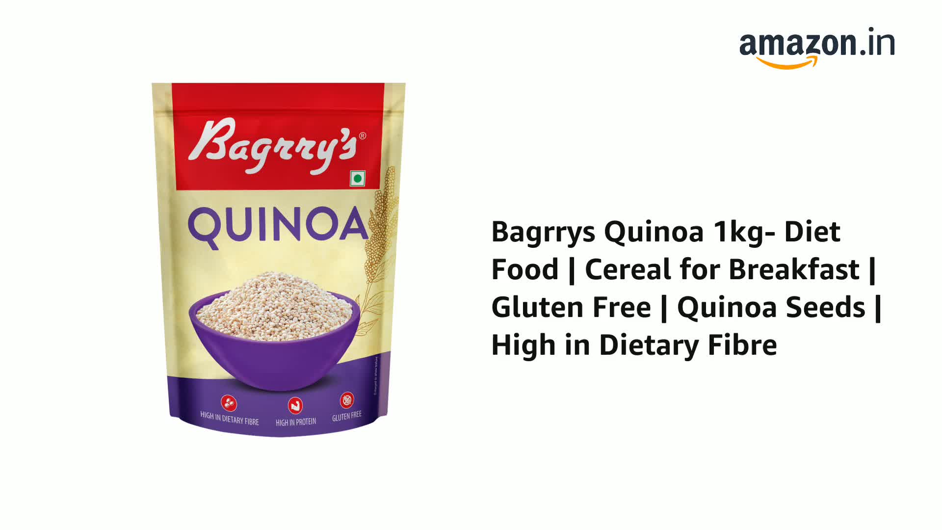 Nutritional Powerhouse: Bagrrys Quinoa is a nutritional powerhouse packed with protein and fibre. It has 9 essential amino acids and is also rich in dietary fibre vitamins and minerals (such as magnesium iron and phosphorus).