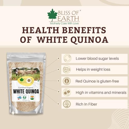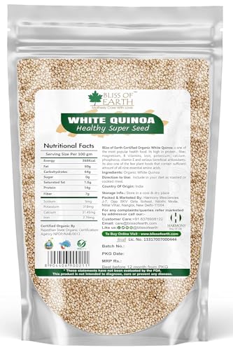 Bliss of Earth Certified Organic White Quinoa is one of the most popular healthfood. Its jigh in protein fiber magnesium B vitamins iron potassium calcium phosphorus vitamin E and various beneficial antioxidants. Its also one of the few plant foods that contain sufficient amount of all nine essential amino acids.