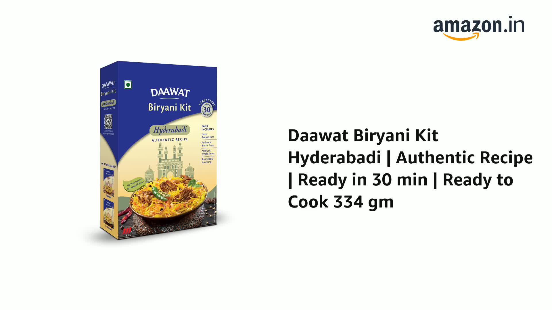 India's finest Basmati brand Daawat brings to you the finest Biryani Kit DAAWAT BIRYANI KIT. Now cook delicious Biryani at home in just 30 minutes and satisfy your anytime Biryani cravings! Daawat Biryani Pastes are made fresh from scratch with choicest ingredients to ensure that we do justice to the rich heritage of the wholesome dish - Biryani. To take your experience a notch higher this pack comes with the finest Basmati Rice from Daawat and Burani Raita seasoning to serve. Available in range of authentic variants Daawat Hyderabadi Biryani Kit Daawat Lucknowi Biryani Kit & Daawat Kolkata Biryani Kit.