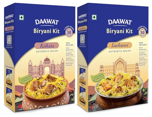 Daawat Biryani Kit Kolkata | Authentic Recipe | Ready in 30 min | Ready to Cook | 334gmIndia's finest Basmati brand Daawat brings to you the finest Biryani Kit â DAAWAT BIRYANI KIT. Now cook delicious Biryani at home in just 30 minutes and satisfy your anytime Biryani cravings! Daawat Biryani Pastes are made fresh from scratch with choicest ingredients to ensure that we do justice to the rich heritage of the wholesome dish - Biryani. To take your experience a notch higher this pack comes with the finest Basmati Rice from Daawat and Burani Raita seasoning to serve. Available in range of authentic variants â Daawat Hyderabadi Biryani Kit Daawat Lucknowi Biryani Kit & Daawat Kolkata Biryani Kit.Daawat Biryani Kit Lucknowi | Authentic Recipe | Ready in 30 min | Ready to Cook | 334 gmIndia's finest Basmati brand Daawat brings to you the finest Biryani Kit â DAAWAT BIRYANI KIT. Now cook delicious Biryani at home in just 30 minutes and satisfy your anytime Biryani cravings! Daawat Biryani Pastes are made fresh from scratch with choicest ingredients to ensure that we do justice to the rich heritage of the wholesome dish - Biryani. To take your experience a notch higher this pack comes with the finest Basmati Rice from Daawat and Burani Raita seasoning to serve. Available in range of authentic variants â Daawat Hyderabadi Biryani Kit Daawat Lucknowi Biryani Kit & Daawat Kolkata Biryani Kit.