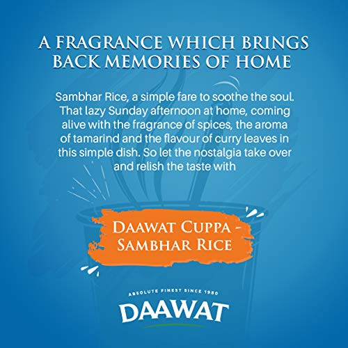 Daawat Cuppa Rice presents to you a delicious and wholesome meal which brings taste and convenience in a cup Enjoy a cup of home goodness that satisfies not just your stomach but craving for familiar food. Made with recipes carefully curated by Daawat Masterchefs using the finest Basmati Rice from Daawat it can be enjoyed anytime on the go. Created with pure fresh and only 100% natural ingredients. No added preservatives No artificial flavour and No artificial colours. The pack comes with a spoon inside for maximum convenience anytime on the go. ENJOY HOME STYLE FOOD ANYWHERE