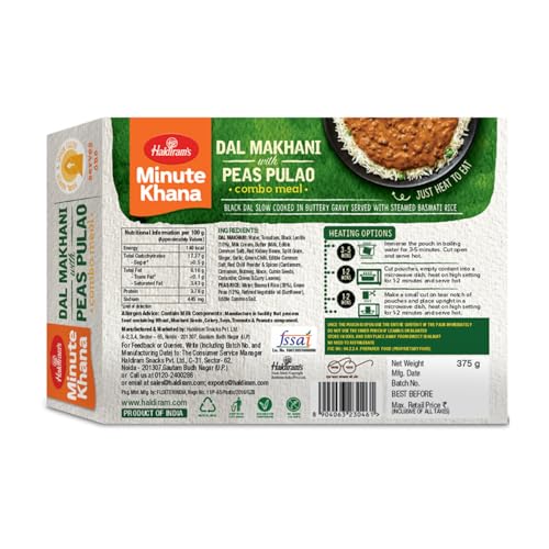 Haldiram Dal Makhni and Peas Pulao is a delicious and convenient readytoeat meal offered by Haldiram a renowned Indian food brand. It combines two classic Indian dishes Dal Makhni and Peas Pulao in a single package providing a wholesome and flavorful meal option. Dal Makhni is a popular Punjabi lentil dish made with black lentils (urad dal) and kidney beans (rajma) cooked together with a blend of aromatic spices butter and cream. It is known for its rich and creamy texture along with its hearty and comforting flavors. The dal is slowcooked to perfection allowing the flavors to meld together resulting in a dish that is both satisfying and indulgent. Peas Pulao on the other hand is a fragrant rice dish made with basmati rice peas and spices. The rice is cooked with a tempering of whole spices like cumin seeds bay leaves and cloves along with the addition of peas which add sweetness and color to the dish. The result is a flavorful and aromatic rice dish that complements the creamy dal makhni.