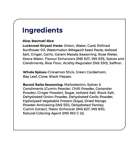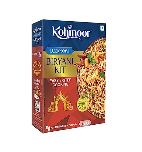 Biryani is India's most loved and ordered dish but it's too difficult to cook as it requires sourcing exotic ingredients and elaborate cooking. Kohinoor introduces India's first complete solution to cook an authentic basmati biryani effortlessly at home. Sourced from the royal kitchens of Nizams Lucknowi Biryani Kit has everything you have been looking for to make the perfect Biryani. With no artificial colours or preservatives this recipe has been curated to give you an Authentic Lucknowi biryani experience. The kit contains finest quality Basmati rice an authentic Lucknowi biryani masala paste made with secret Nizami ingredients and aromatic whole spices all ready to be cooked with convenience to perfection. At Kohinoor we are passionate about bringing the right blend of authenticity trust and convenience to everyday cooking to make your every mealtime moment better. Crafted by our culinary experts our biryani kit has all the fine essentials you will need to create an authentic aromatic biryani in just 30 minutes in your kitchen. All you need to do is add vegetables/ chicken/ meat and enjoy this royal delicacy bursting with the flavors of exotic spices along with basmati rice. You do the cooking; we help you with convenience of preparation. Warning: Do not use if the inner pouch is leaking or bloated. Once opened consume immediately.
