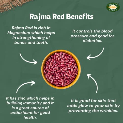 Milletamma's Rajma Red is rich in Magnesium which helps in strengthening of bones and teeth. It has zinc which helps in building and it is a great source of antioxidant for good health. It is good for skin that s glow to your skin by preventing the wrinkles. It controls the and good for s. Storage: Keep your favourite Milletamma's Rajma Red in a cool and dry place for 3 months. These beans are a storehouse of protein and an ideal replacement for red meat. In fact pig hot rajma chawal is a perfect balance of protein on par with dairy or meat protein without added and saturated fat. A cup of bean provides 15grams of protein. beans are an excellent source of minersuch as copper ganese phosphorus molybdenum and vitamins B1 and folate. Negligible sugar content inherently high on dietary fibres and possessing a low glycemic index (GI) these wholesome beans serve as an ideal ition to a diet. Composed of starchy carbohydrates B vitamins and ample roughage beans facilitate smooth and ensure optimal . Moreover these legumes are packed with profuse quantities of isoflavone and flavonoid antiwhich aid in controlling preventing sudden in and preserving cardiac muscle function and wellness. The richness of nutrients in beans hence provides a host of healing health benefits including regulating lowering and ing .
