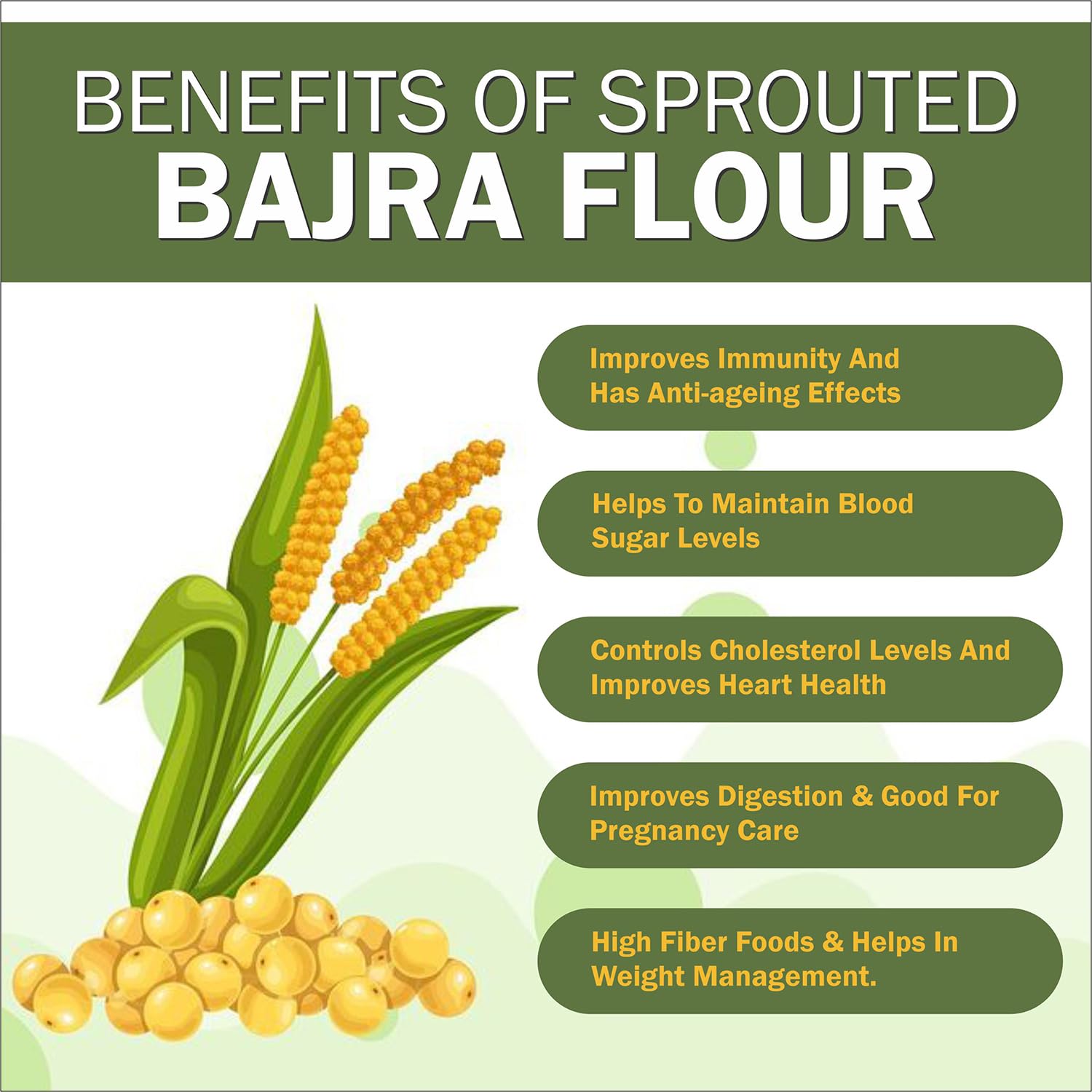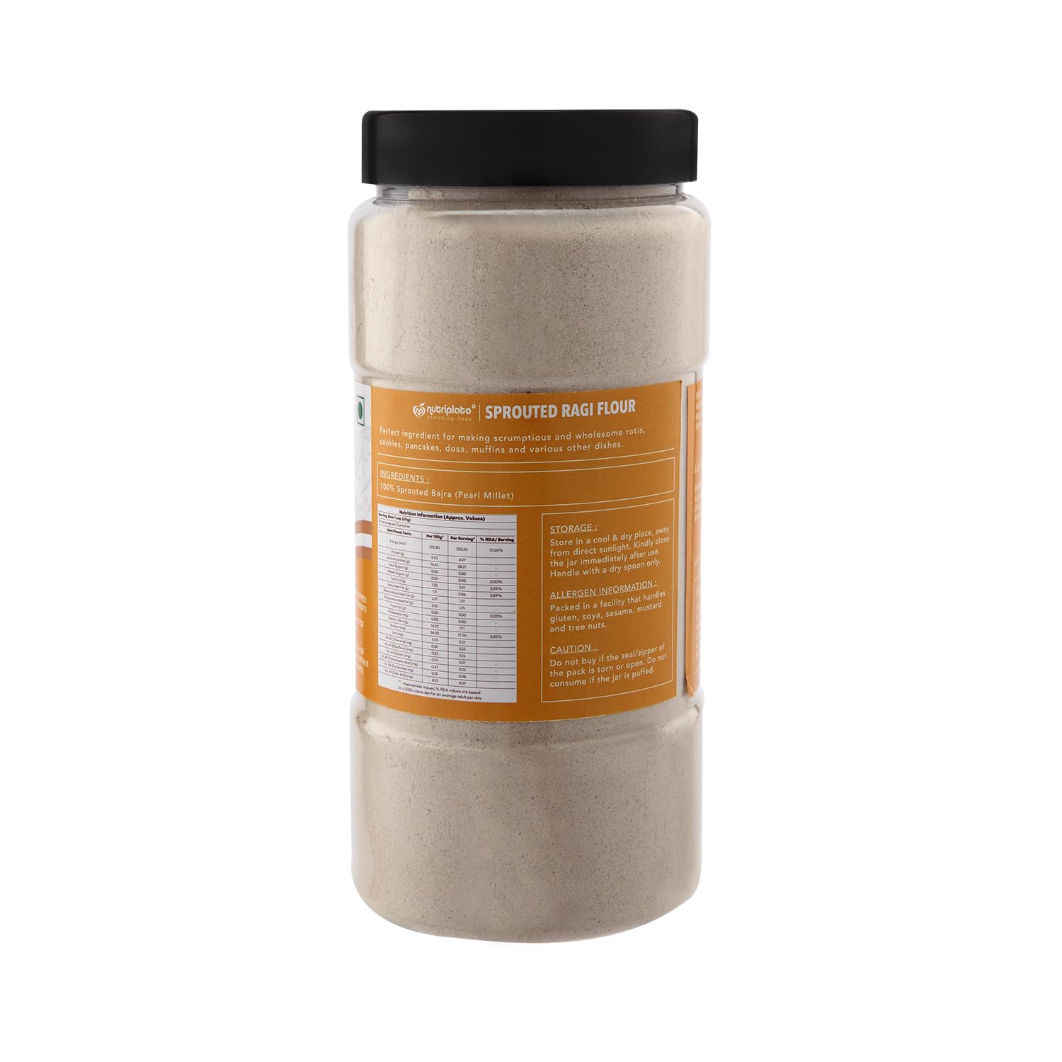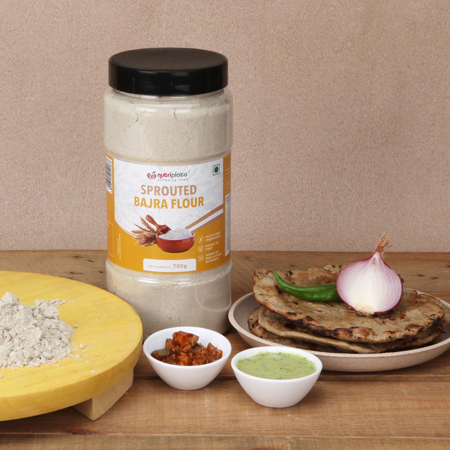Our 100% Natural Sprouted Bajra Flour is a nutritious addition to your pantry offering enhanced absorption of minerals and improved protein digestibility through the sprouting process. Bajra rich in iron fiber and B-complex vitamins supports overall health and well-being. This flour may aid in improving digestive health and support weight management making it an excellent choice for a balanced diet. Use our Sprouted Bajra Flour to create wholesome and delicious rotis dosas and porridge providing a nutritious alternative to traditional flours. Embrace the natural goodness of sprouted grains with our Sprouted Bajra Flour for healthier tastier meals. Trust Nutriplato to enrich your life with natural goodness.