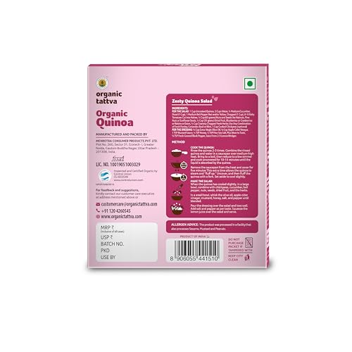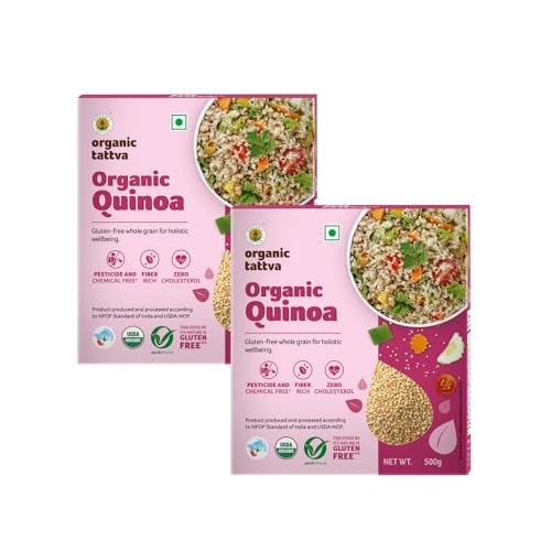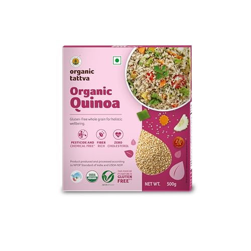 Organic Tattva Organic Quinoa is gluten free and high in protein Fiber Iron Omega 3 and other essential nutrients and Antioxidants. It's one of the few plant foods that contain al nine essential Amino Acids the reason which it's also known as Superfood and sometimes âAstronaut Food'. Quinoa gluten-free is a superfood jammed with many nutrients. It can be replaced in place of white rice for people who are on a strict diet. It is an ancient food comprising of all essential nutrients and is healthy for any person. Organic Tattva Quinoa is naturally gluten-free composed of a mixture of vitamins minerals and nutrients required by the body for carrying out the overall functioning of the human body. These are small White Quinoa Seeds that are power-packed with protein and is a fantastic wheat-free alternative providing all the nine essential amino acids. Organic Tattva Quinoa seeds per scoop provides enough nutrients to your body which satisfies your hunger and curb food cravings all day long. It is a complete vegetarian protein our quinoa provides a complete range of 9 essential and non-essential amino acids helping to maintain lean muscle mass and support enzyme production for everyday health. Quinoa seeds helps to improve metabolic health by maintain blood sugar insulin and triglyceride levels. Quinoa is tasty and known to go well with many foods Quinoa is a very convenient choice for breakfast (as a cereal) lunch (as a salad) or dinner (as a side). Switch to Organic Quinoa by Organic Tattva for a healthier you.
