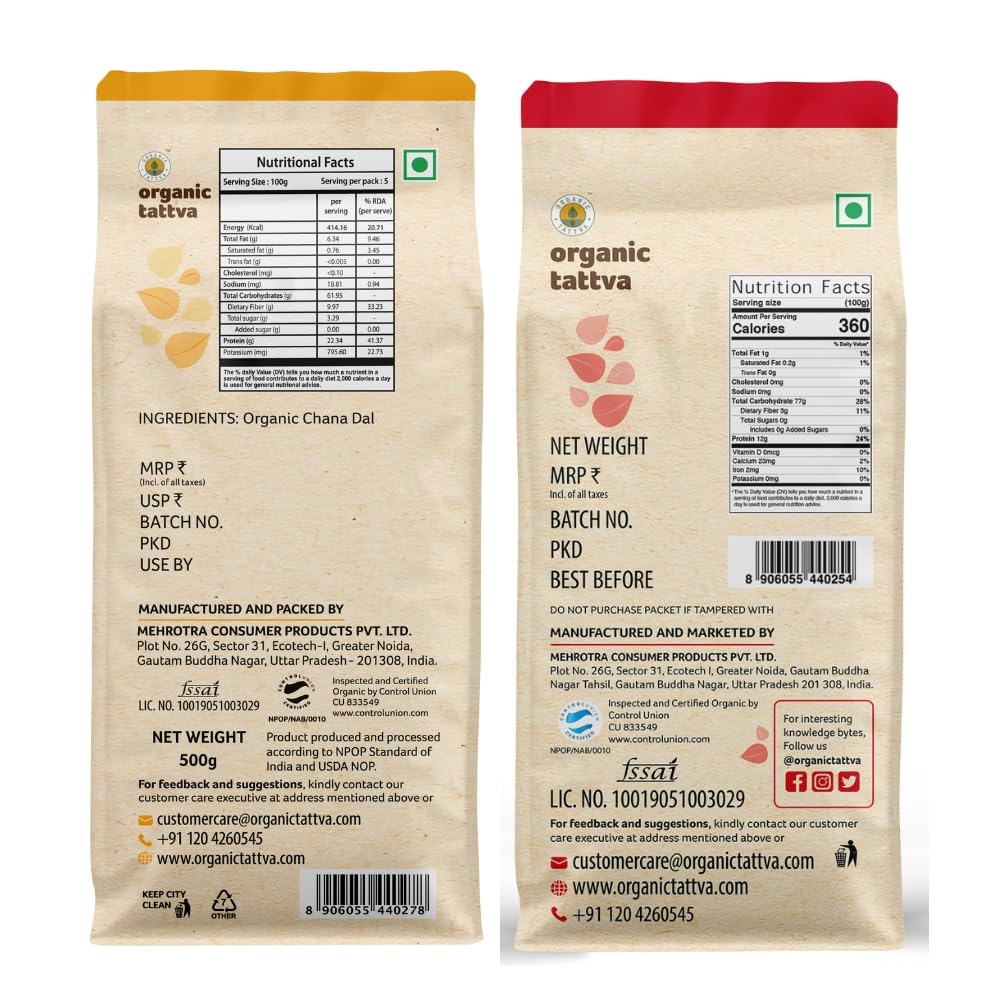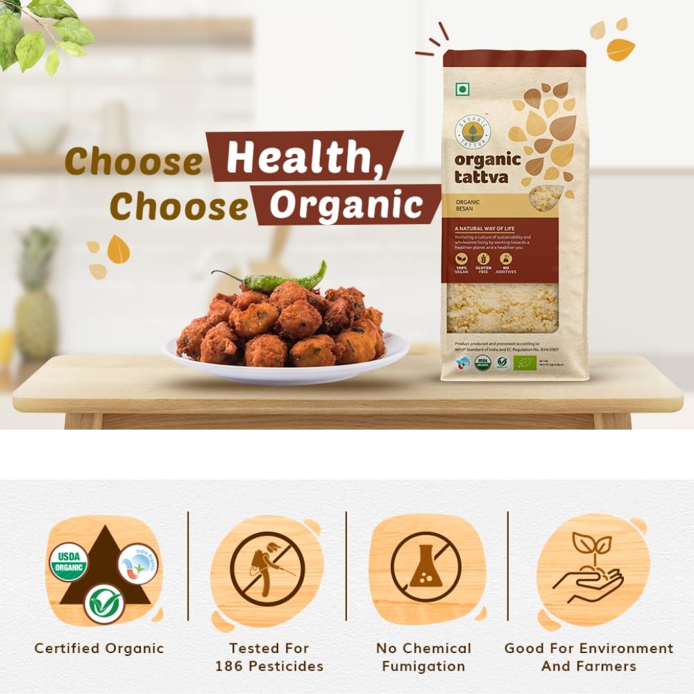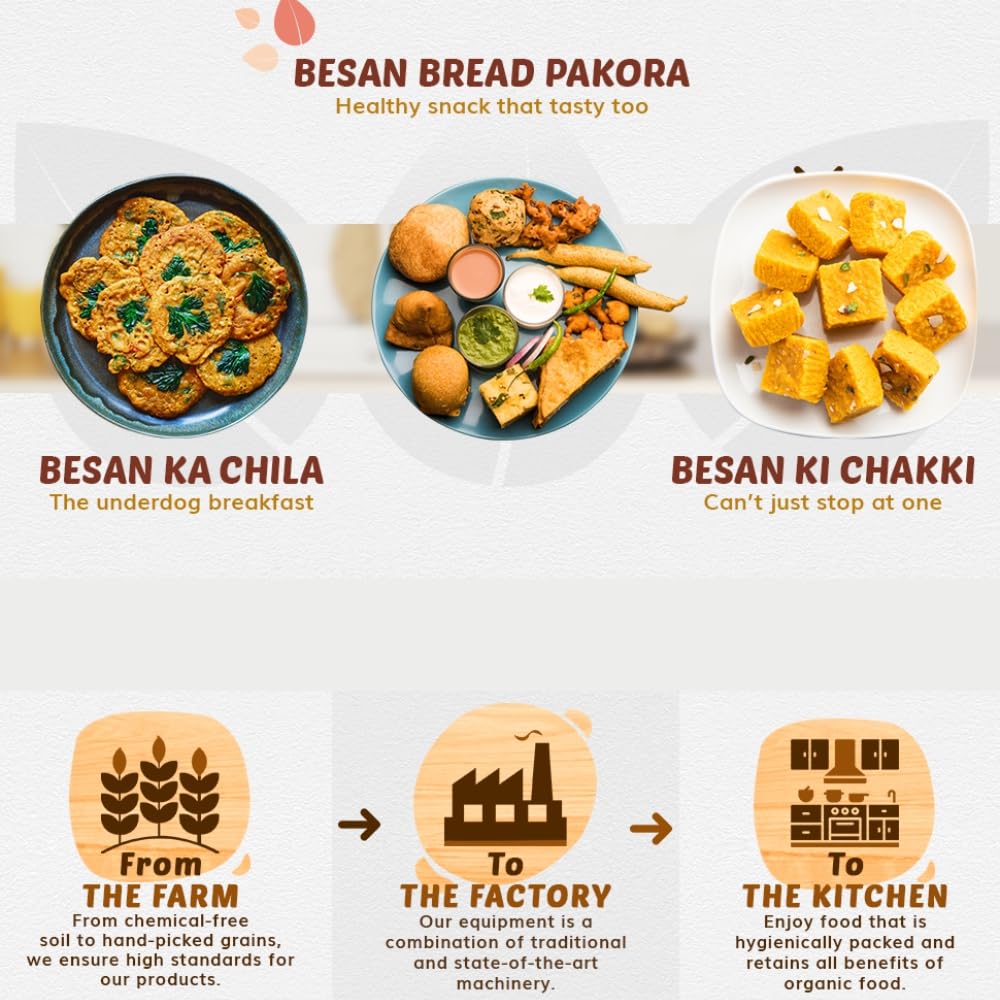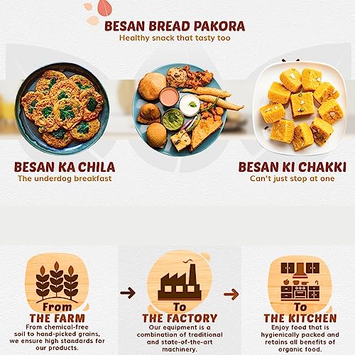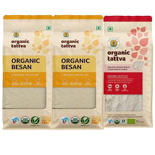 In this Pack you will get Organic Gluten Free Besan 1Kg and Organic Maida 500 gram Organic Tattva Besan is without any pesticides and chemicals. It is of premium quality Chana Dal is processed In-house in our state-of-the-art facility to make besan.To maintain uniform and premium quality many quality checks are followed Besan is by its nature Gluten Free. (Disclaimer: It only explains the nature of the product and is no way a claim) Organic Tattva Besan can be used for making many Indian dishes like Kadhi laddu dhokla etc
